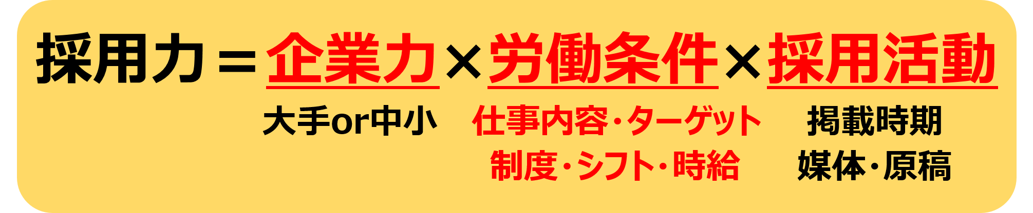 企業力・労働条件・採用活動の掛け算で採用力は決まりますが、私は採用活動で過去さまざまなことにチャレンジしてきた為、今回私が重視した部分はこの真ん中の「労働条件」です。その中でも、仕事内容・ターゲット設定に今回は注目していきたいと思います。