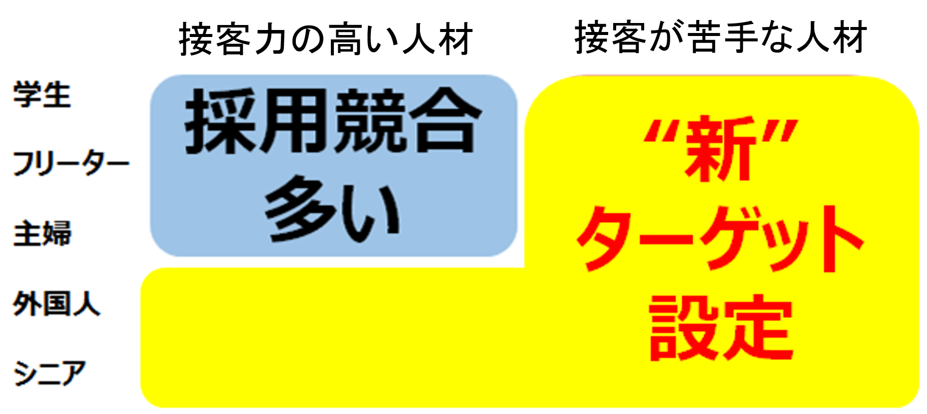 このように飲食店業界では、接客力が高い学生・主婦・フリーターの青色ゾーンは人気で、採用競合が多くなり、接客があまり得意ではない人材の黄色いゾーンは採用競合が少なくなります。