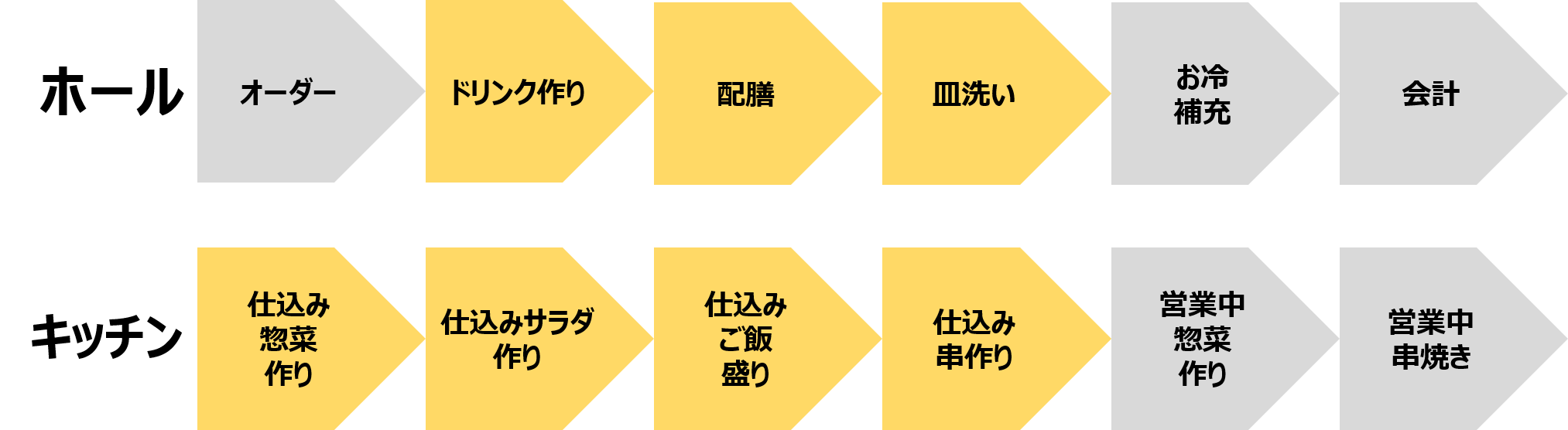 ホール・キッチン、それぞれの業務をまず、ビジネスプロセス分解しました。