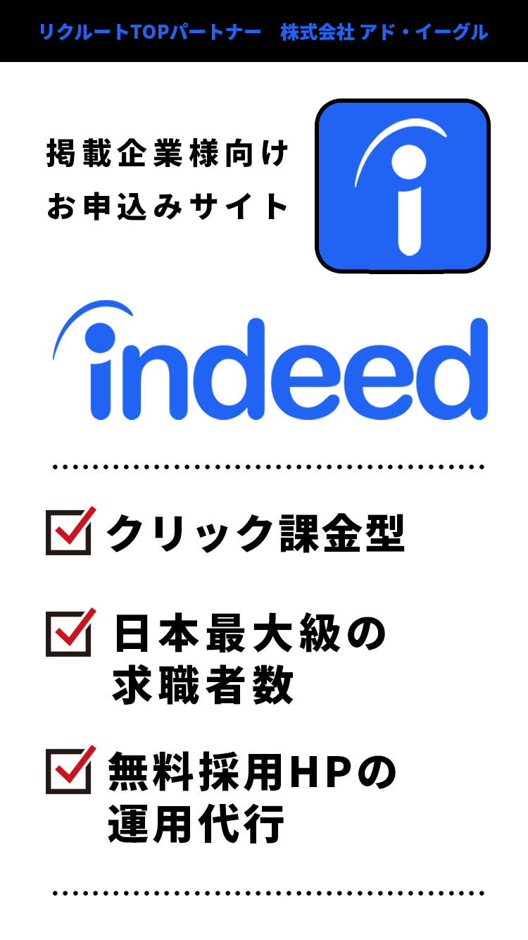 リクルートグループがご用意している無料採用サイト作成サービス「Airワーク」で御社専用の採用サイトを無料で作成。2週間2万円〜安価にIndeedへ掲載が可能です!※弊社が作成した自社の無料HPはコチラ(ここまで無料で作成できます!) https://adeagle.jbplt.jp/
