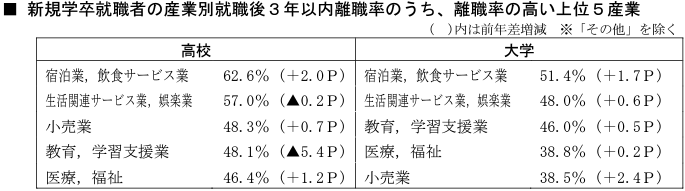 引用:厚生労働省 新規学卒就職者の産業別就職後3年以内離職率のうち、離職率の高い上位5産業
