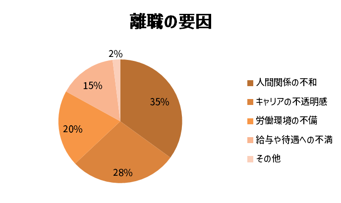 離職の要因として最も多いのは「人間関係の不和」であり、全体の35%を占めます。次に多いのが「キャリアの不透明感」(28%)で、従業員が将来のキャリア形成に不安を抱えることが原因です。また、「労働環境の不備」(20%)や「給与や待遇への不満」(15%)も大きな要因となっています。これらの要因は、多くの場合複合的に絡み合い、早期離職につながるため、企業は全体的な改善を図る必要があります。