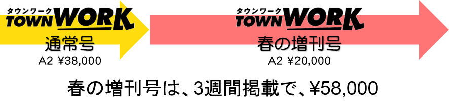 2020年3月は「春の特別号」(通称春フリ)として、3月16日号発行号のタウンワーク(通常版)に掲載することで、翌3月23日~4月5日の2週間、プラス2万円~の料金で掲載できます。※計3週間掲載。