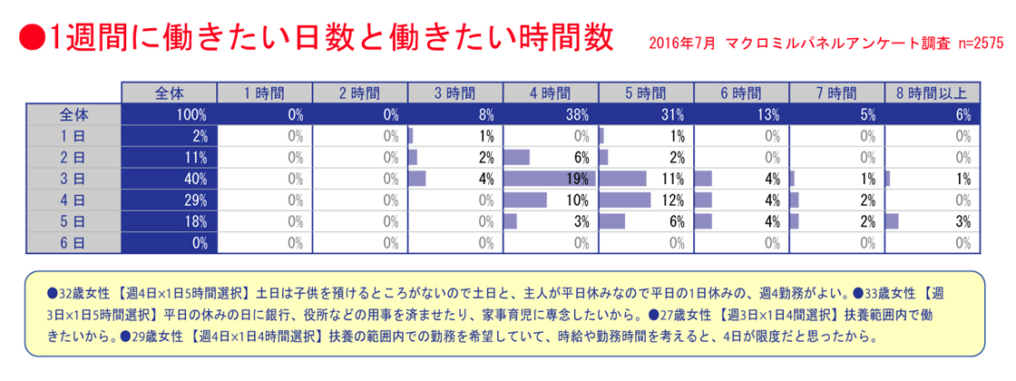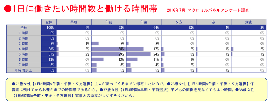 多くの主婦(ブランク)層は給与の高さよりも、仕事内容・勤務地・勤務時間を検討材料にしています。小さなお子さんの子育てをしている方が多いためか、家事との両立がしやすい午前中~夕方までの限られた時間での働き方を希望したいと考えている方がほとんどのようです。
