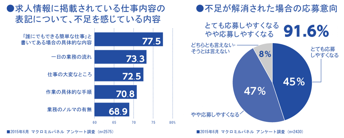 また、求職者の7割が「仕事の大変なところ」の記載を求めています。雇用側としては、「大変なことなんて書いたら、応募してもらえないのでは?」と不安に思われるかもしれませんが、求職者にとっては「自分はこの仕事に耐えられるのか・長く働けるのか」の判断を行うためにも必要不可欠な情報です。何が大変で何が楽なのか…その判断基準はひとそれぞれなので、「大変なこと=マイナスイメージ」という先入観を捨てて、求職者が最適な判断のもと応募ができるように、なるべく情報はオープンにしましょう。これにより有効応募の増加やミスマッチングを防ぐ要因も作ることができます。