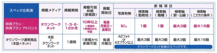 ◆枠得プラン:タウンワークネットへのみ掲載、10原稿4週間\45,000円~、掲載中も随時修正可能、最短で翌営業日より掲載可能、写真掲載は一切なし