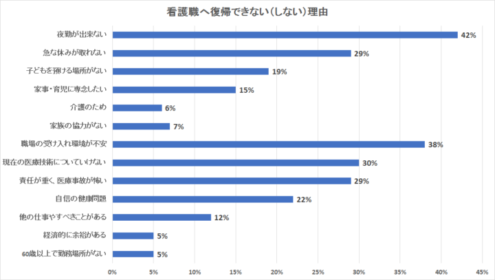 このグラフから、時間や休みといった「労働環境」、そして仕事内容や人間関係の「職場環境」がネックになっていると分かります。こういったネックを解消できる体制を整え、求人広告へしっかりと記載していきましょう。「夜勤なし」「子育てと両立しているスタッフが多いので、急な休みにも対応&みんな理解がありますよ」等、働いている方は当然と思っていることも復職希望者にとっては重要な事項である場合も多いです。
