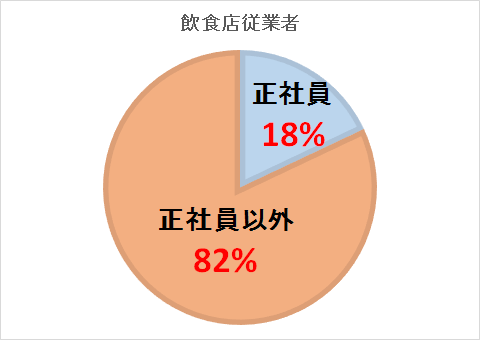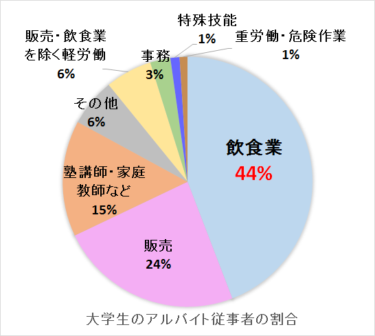総務省の2018年の調査によると、飲食店で働く従業員のうち82%が正社員以外(アルバイト・パート等)でした。また、平成30年度学生生活調査の学生のアルバイト先の44%が飲食業という結果から、飲食業の「アルバイト」における就業内訳は学生が大半を占めていることがわかります。