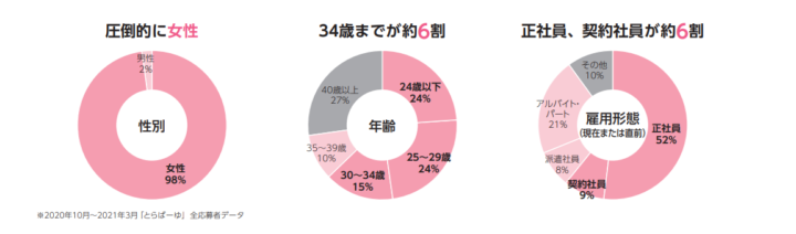 とらばーゆは株式会社リクルートが運営する「女性の就職・転職をサポートするサイト」です。とらばーゆユーザーの多くは、”社会経験のある転職意欲の高い女性”です。利用男女比率は女性98%、男性2%と圧倒的に女性のユーザーが多く、女性をメインで募集したい企業様へはピッタリの媒体です。正社員・契約社員として働く20~34歳女性リーチに強い媒体です。